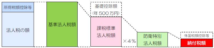 税額:所得税額控除など一定の税額控除を適用しないで計算した法人税の額から年500万円の基礎控除を控除した金額に4%の税率を乗じて計算した金額
