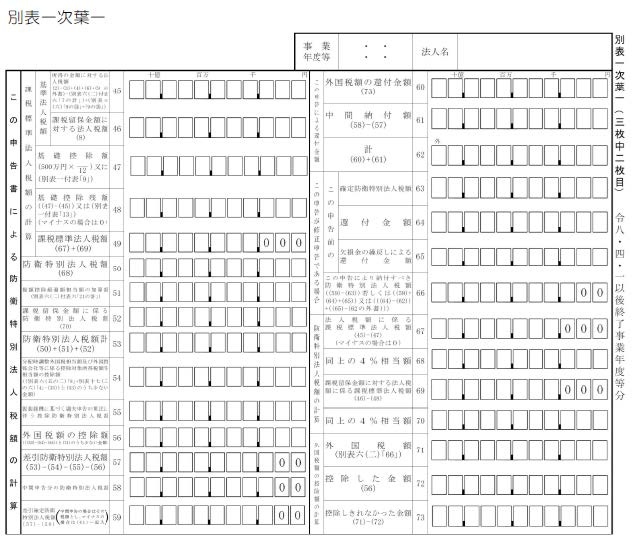 また、上記のほか外国税額の控除の計算に関する明細書(別表六(二)等)や予定申告書の様式(別表十九等)等については、同一の様式中に防衛特別法人税に関する所定の各欄を加えることとなっています。